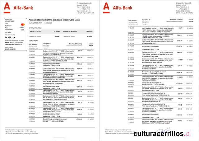 Russia Alfa Bank account statement Word and PDF template, 2 pages download template file