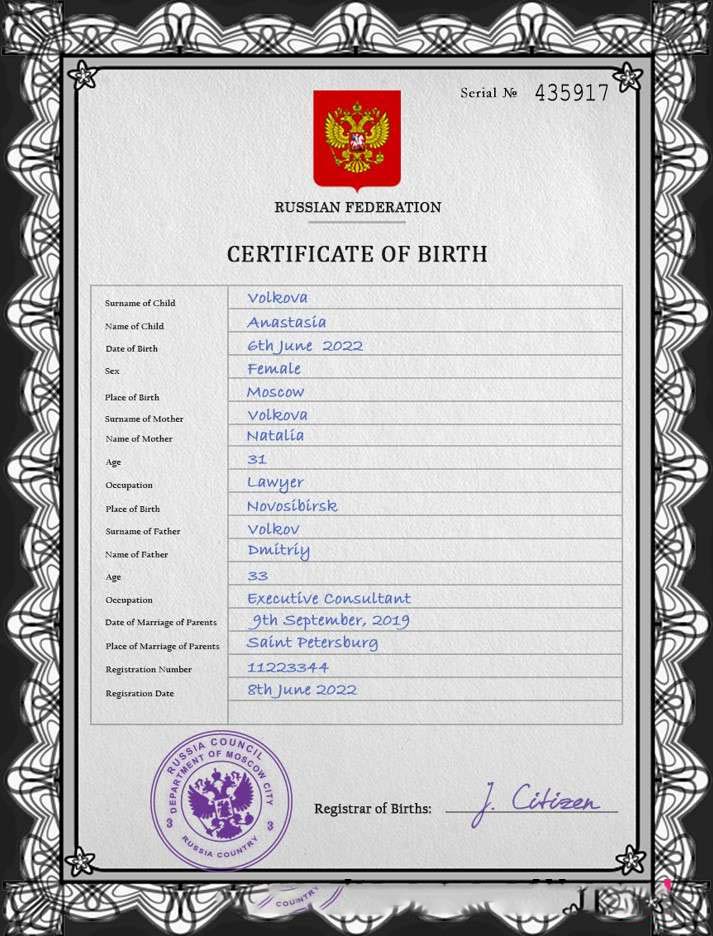 Russia vital record birth certificate PSD template, download template file