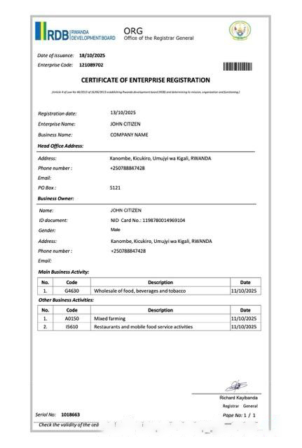 Rwanda certificate of enterprise registration Word and PDF template download template file