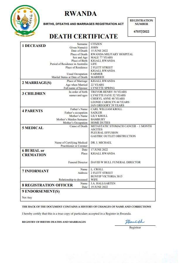 Rwanda vital record death certificate Word and PDF template download template file