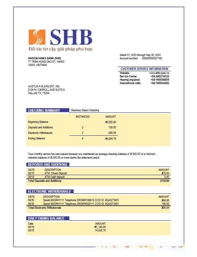 Saigon Hanoi Bank (SHB) organization account statement Word and PDF template download template file