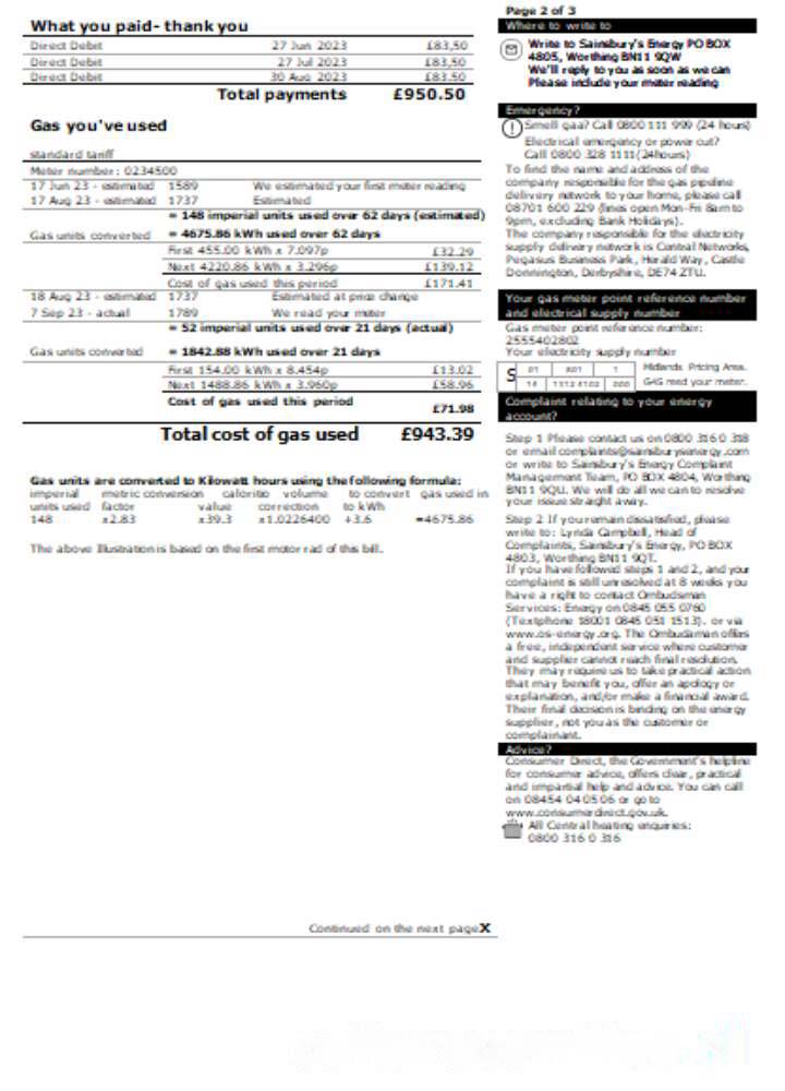 Sainsbury Energy (British Gas) business utility bill, page 2. SCR download template file