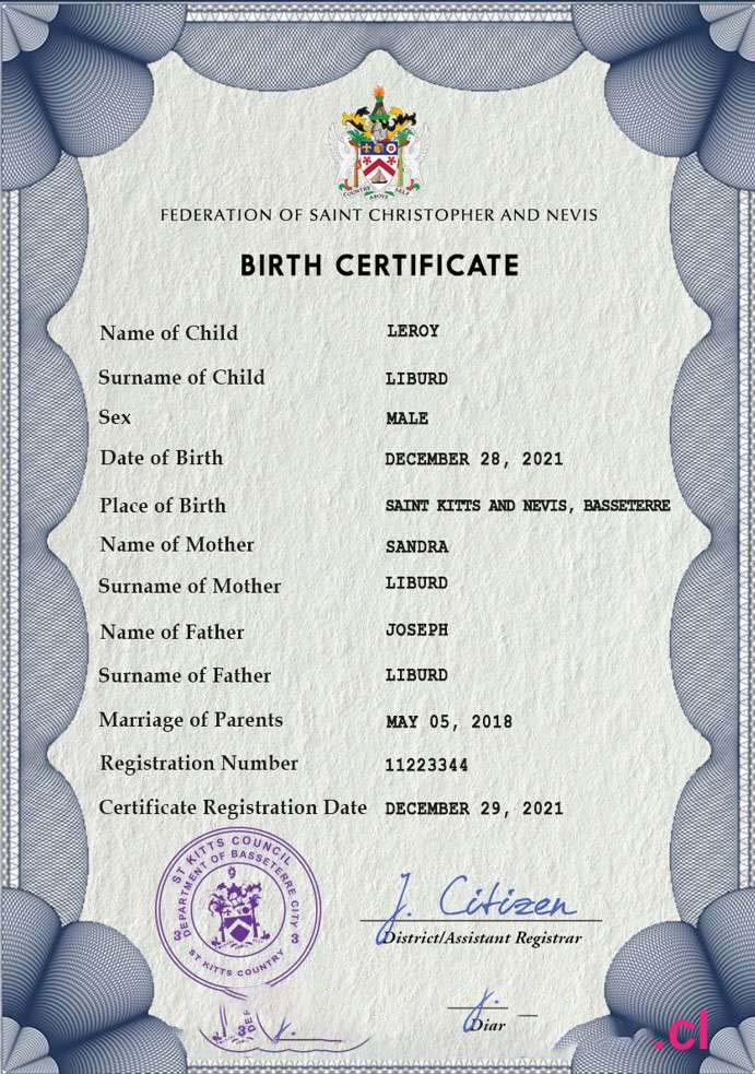 Saint Kitts vital record birth certificate PSD template download template file