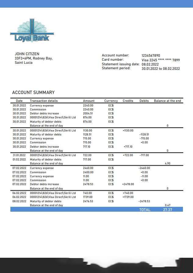 Saint Lucia Loyal Bank statement download template file