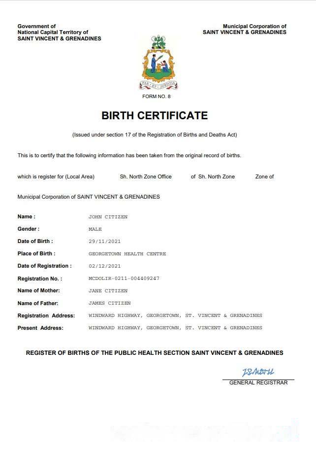 Saint Vincent & Grenadines vital record birth certificate Word and PDF template download template file