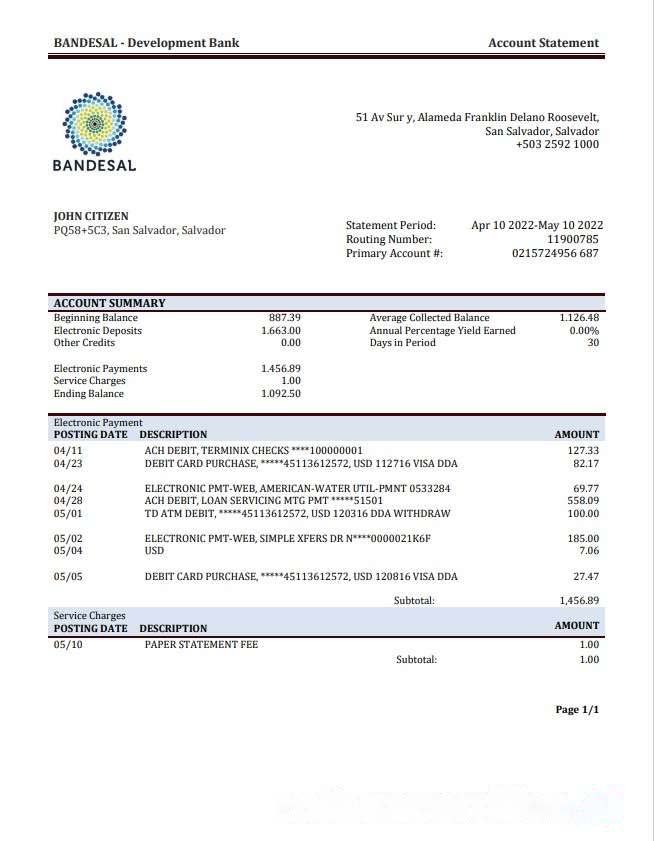 Salvador Bandesal Bank statement download template file