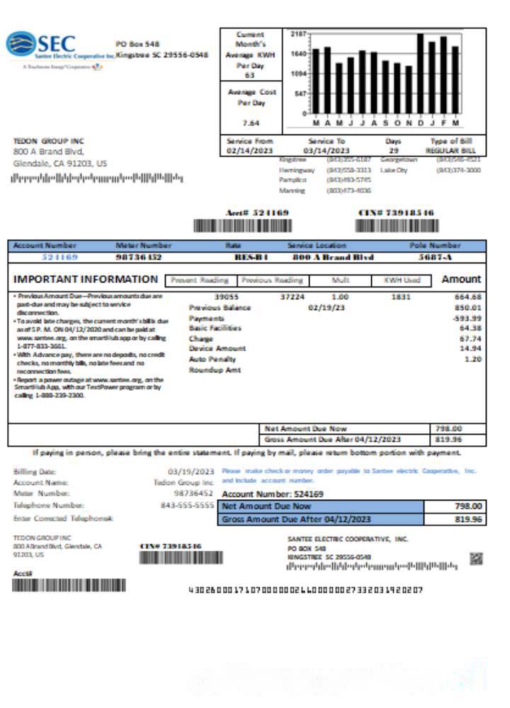 Santee Electric Cooperative Inc (SEC) proof of address utility business bill, SCR download template file