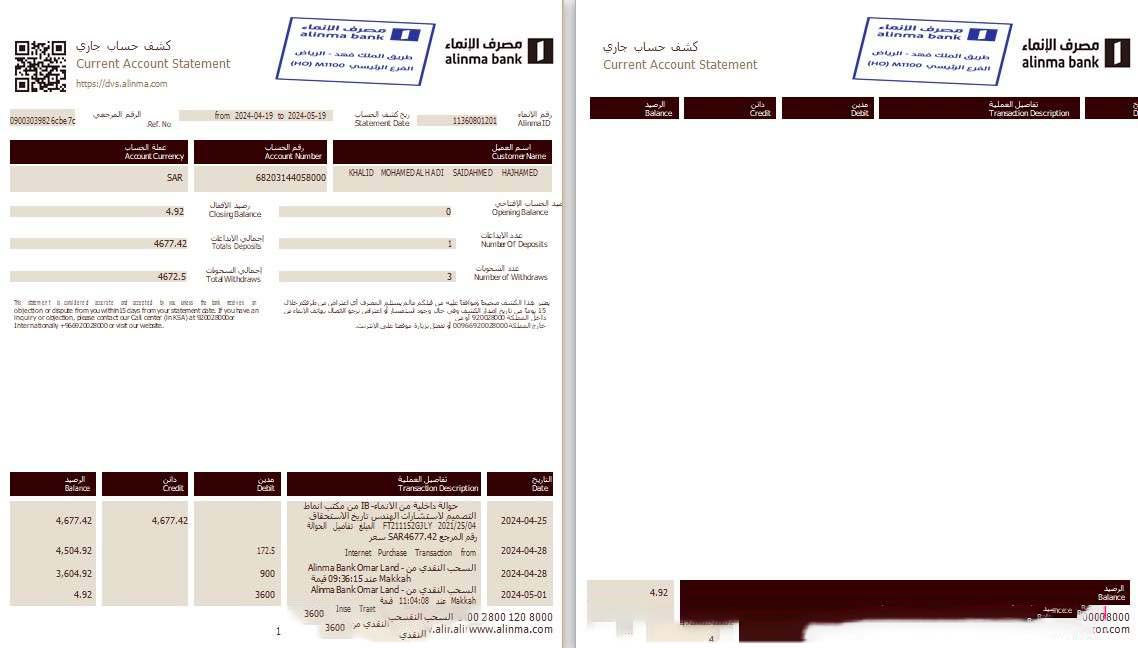 Saudi Arabia Alinma bank statement 3 ?C 6 months Word and PDF example, 2 pages download template file