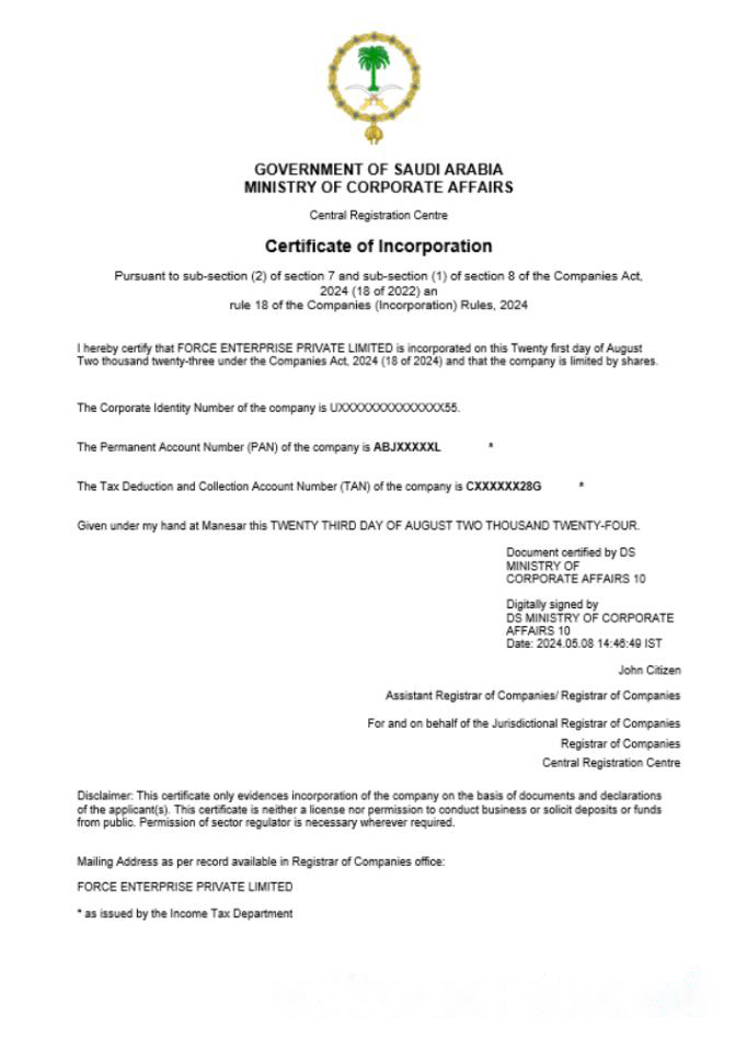 Saudi Arabia business registration certificate Word and PDF template (1) download template file