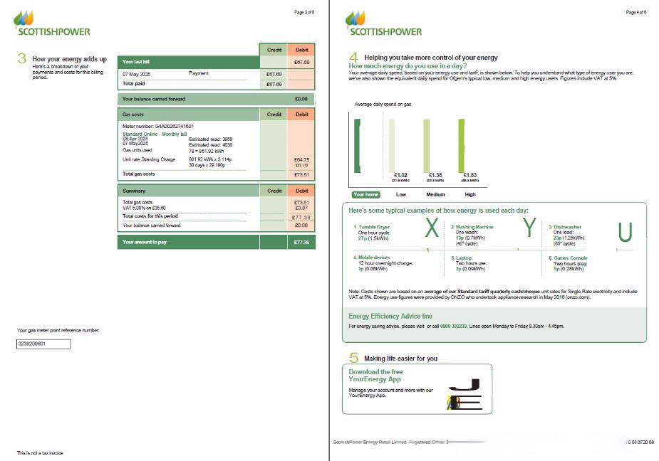 Scotland Scottish Power utility bill template in Word and PDF formats, 6 pages, 3 4 pages download template file