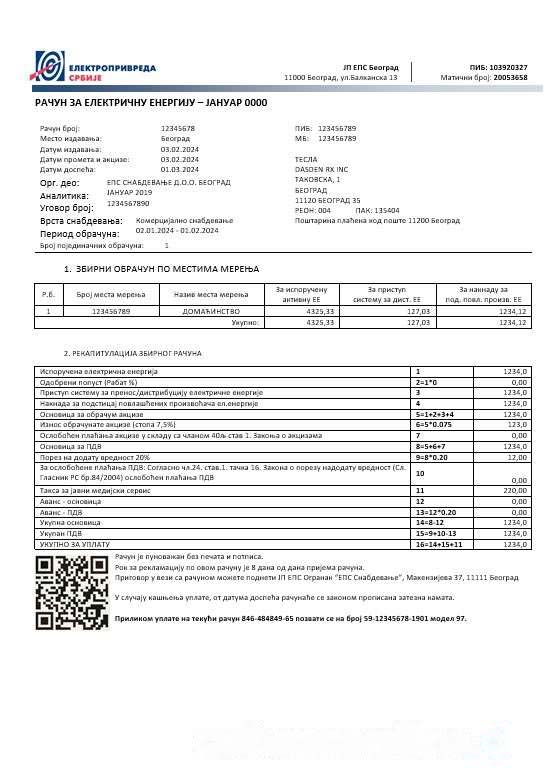 Serbia Електропривреда Србиjе electricity business utility bill template in Word and PDF formats download template file