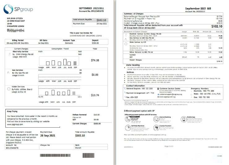Singapore SP Group utility bill template in Word and PDF format (2 pages) download template file