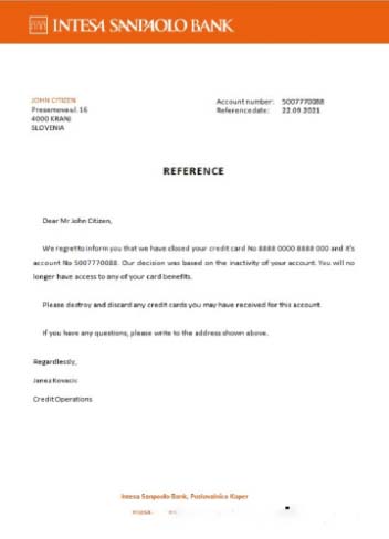 Slovenia Intesa Sanpaolo bank closure reference download template file