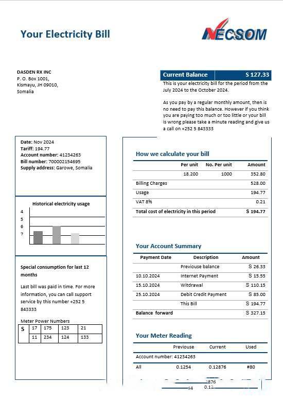 Somalia NESCOM Company electricity business utility bill template in Word and PDF formats download template file