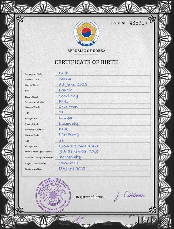 South Korea birth certificate PSD template download template file