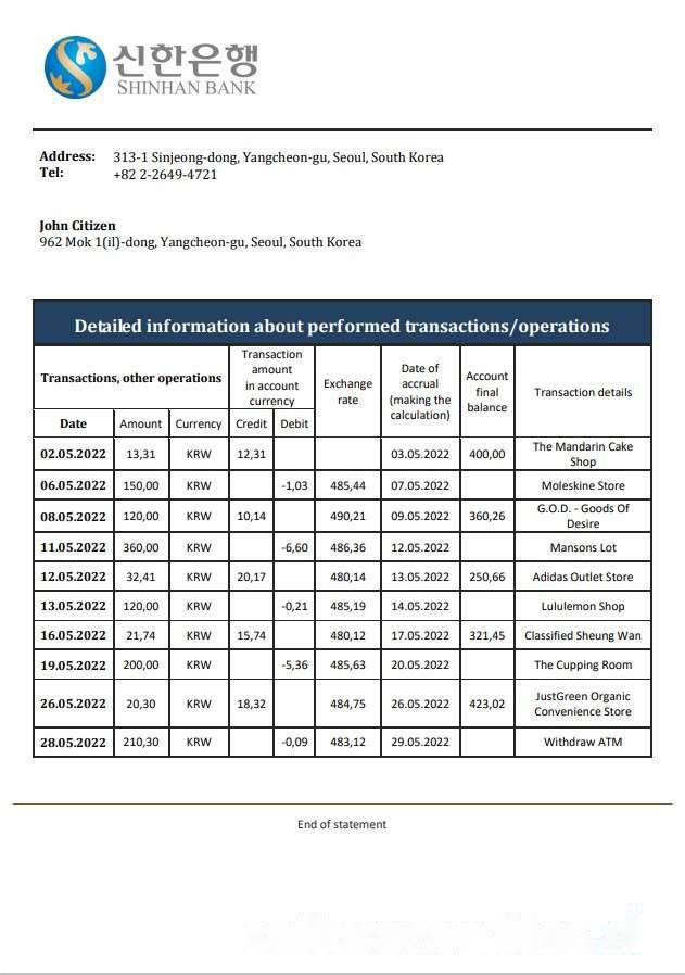 South Korea Shinhan Bank statement download template file