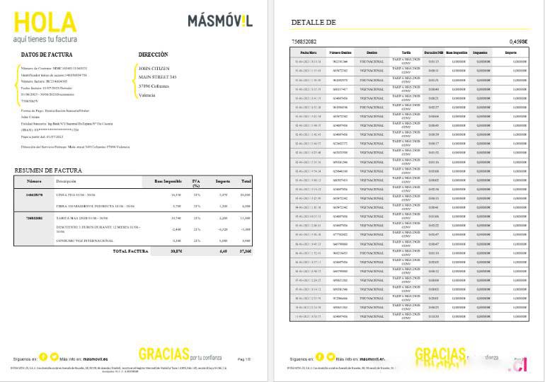 Spain Masmovil internet utility bill Word and PDF formats, 6 pages download template file