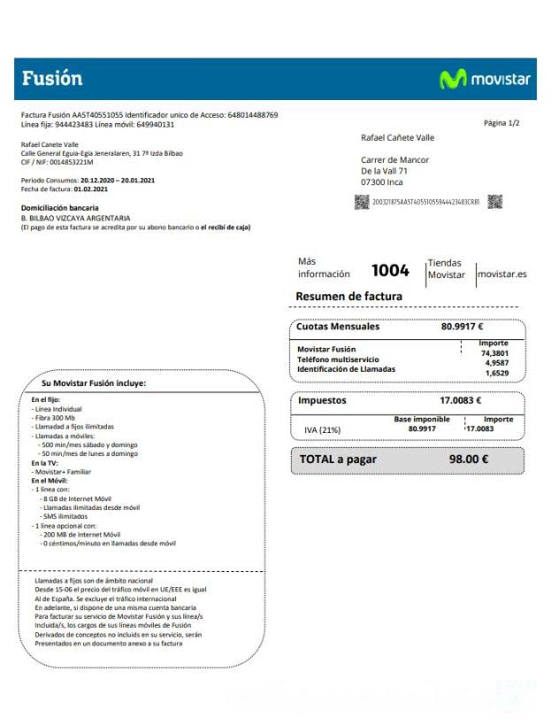 Spain Movistar Fusion telecom operator utility bill document in Word and PDF format download template file