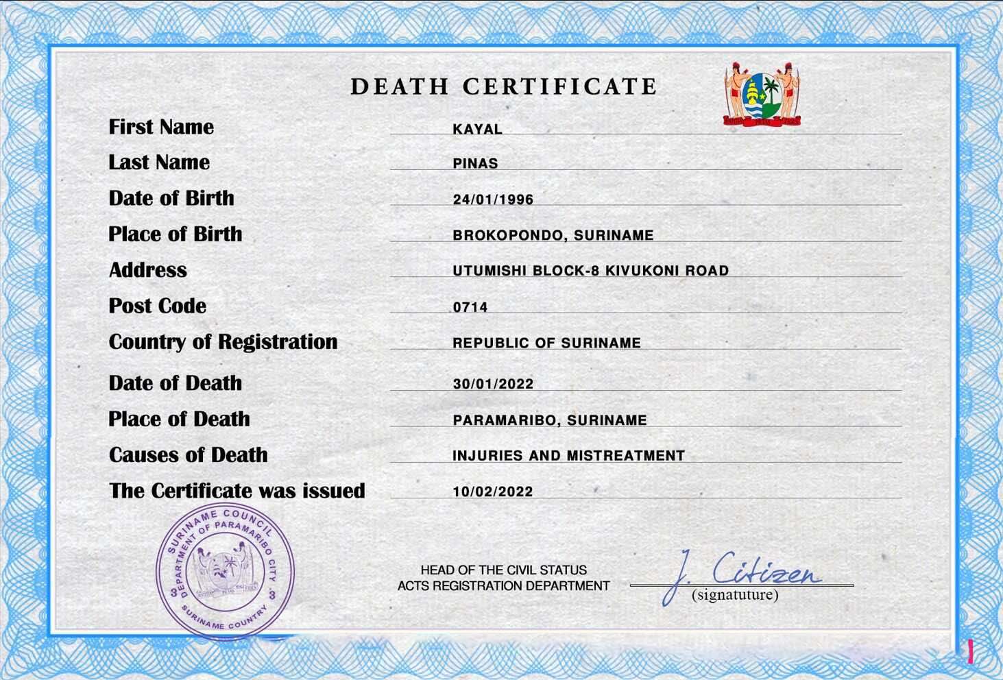 Be the first to review “Suriname vital record death certificate PSD template download template file”
