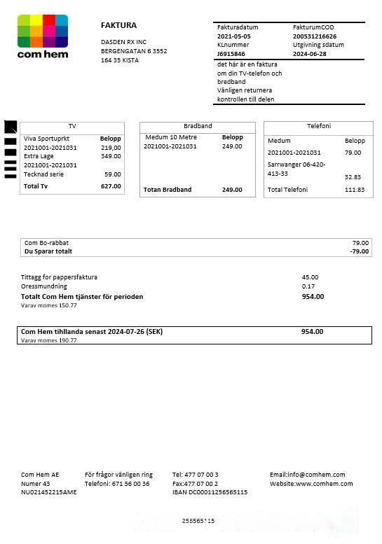 Sweden Com Hem business utility bill template in Word and PDF formats download template file