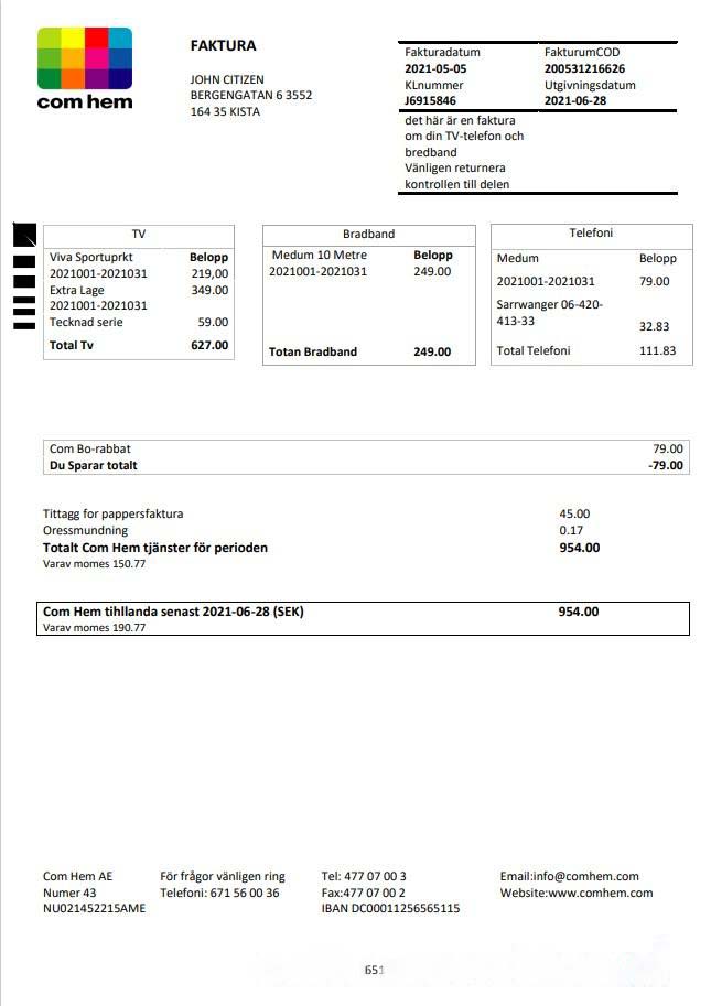 Sweden Com Hem utility bill template in Word and PDF format download template file