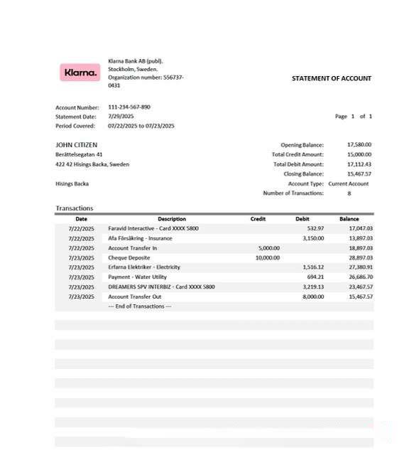 Sweden Klarna Bank statement of account Word and PDF template download template file