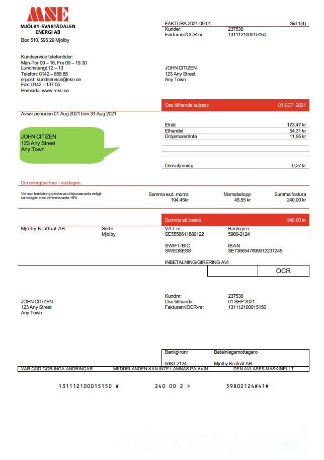 Sweden Mjölby Kraftnat AB utility bill template in .doc and .pdf format download template file