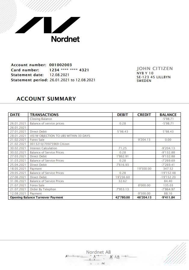 Sweden Nordnet AB bank statement easy to fill template in .doc and .pdf format, fully editable download template file