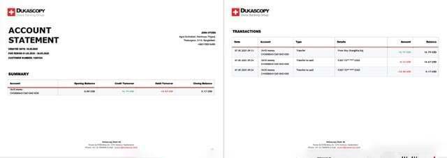Switzerland Dukascopy Bank account statement Word and PDF template, 2 pages download template file