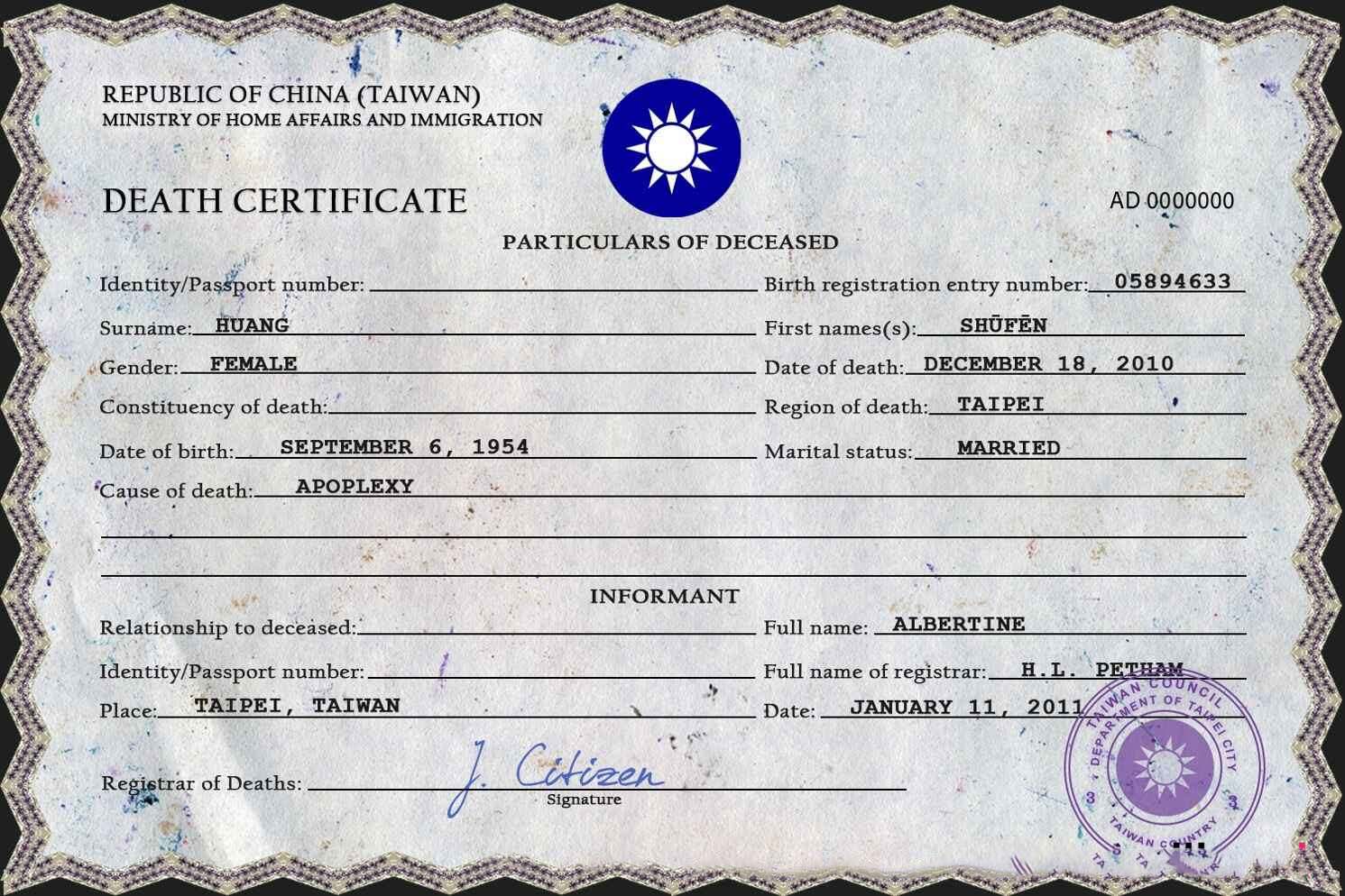 Taiwan death certificate PSD template download template file