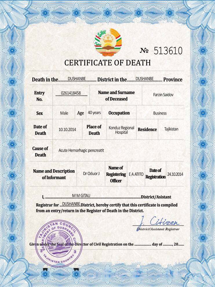 Tajikistan vital record death certificate PSD template download template file