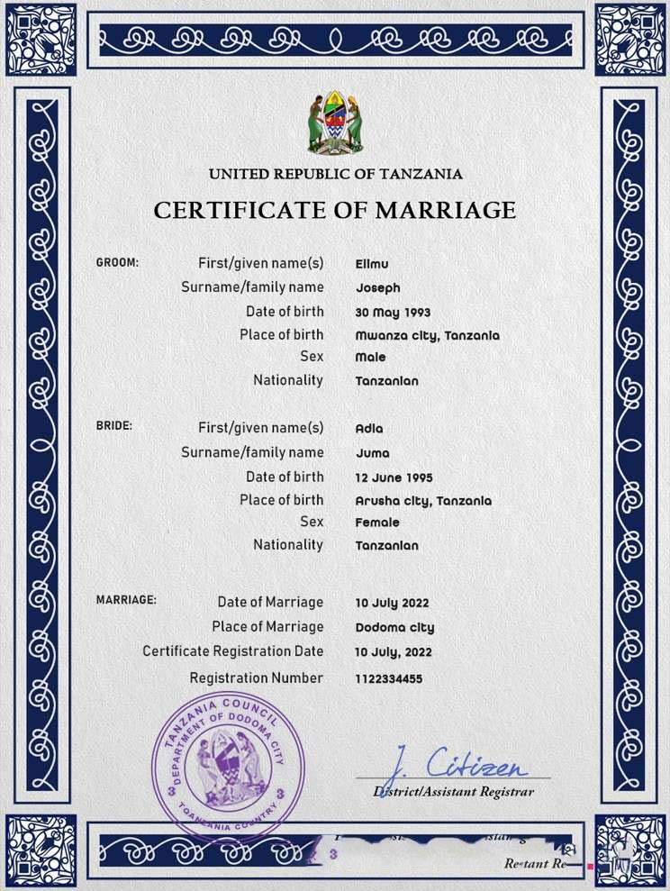 Tanzania marriage certificate PSD template download template file