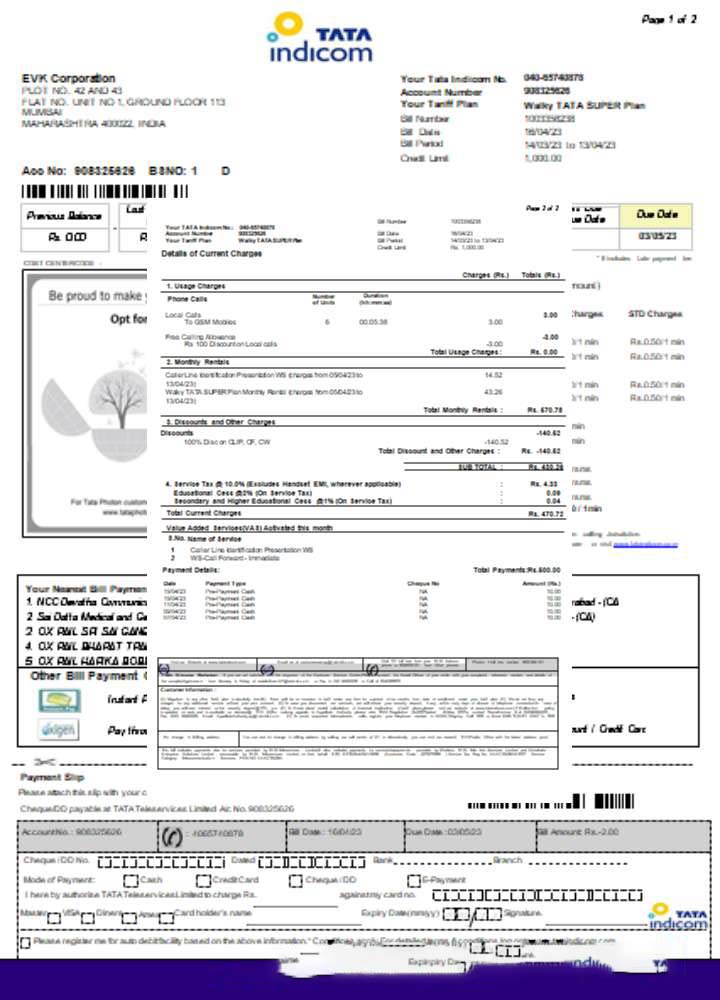 Tata Indicom mobile utility business bill, page 2, SCR download template file