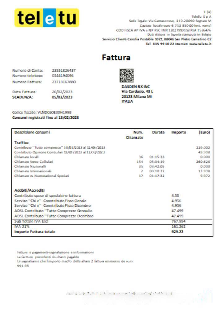TeleTu S p A utility business bill, SCR download template file