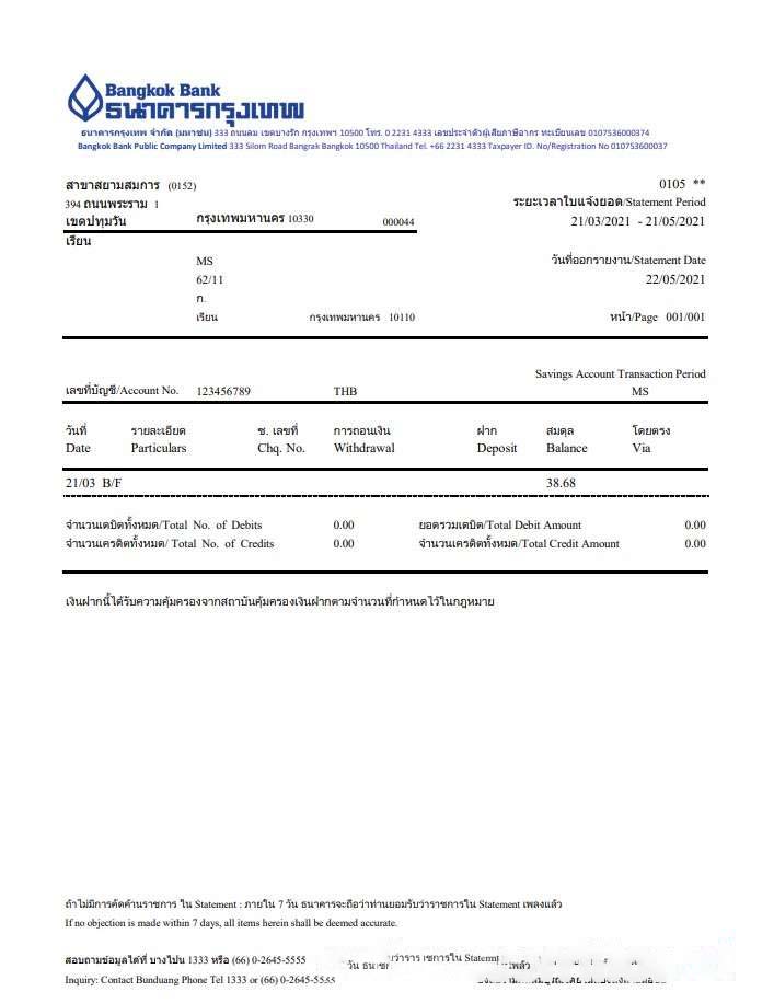 Thailand Bangkok Bank online banking transaction statement template in Word and PDF format download template file