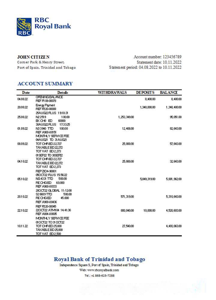 Trinidad and Tobago Royal bank statement, Excel and PDF template download template file