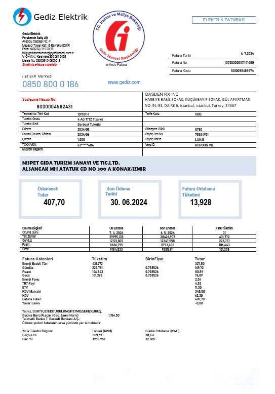 Turkey Gediz Elektrik business utility bill template in Word and PDF formats, fully editable download template file