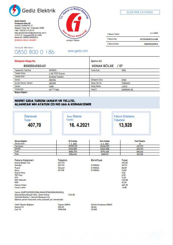Turkey Gediz Elektrik utility bill template in Word and PDF format, fully editable download template file