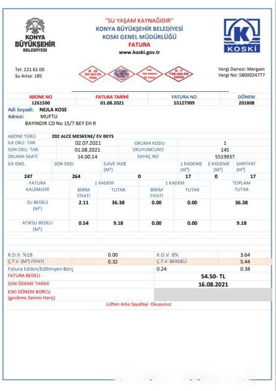 Turkey water utility bill template in Word and PDF format download template file
