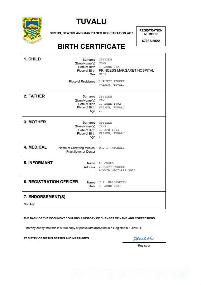 Be the first to review “Tuvalu birth certificate Word and PDF template download template file”