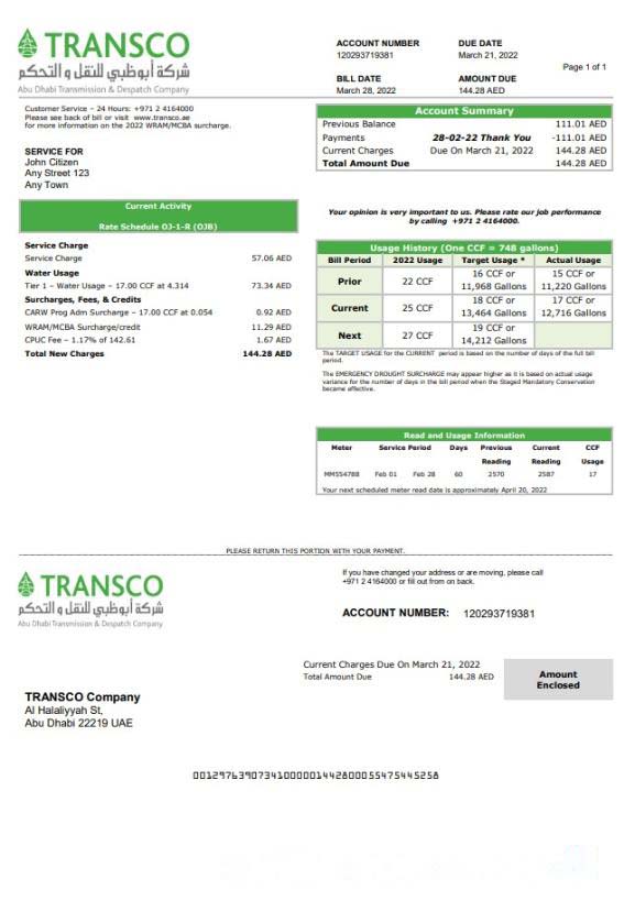 UAE Abu Dhabi Transmission & Despatch Company (TRANSCO) utility bill template in Word and PDF format download template file