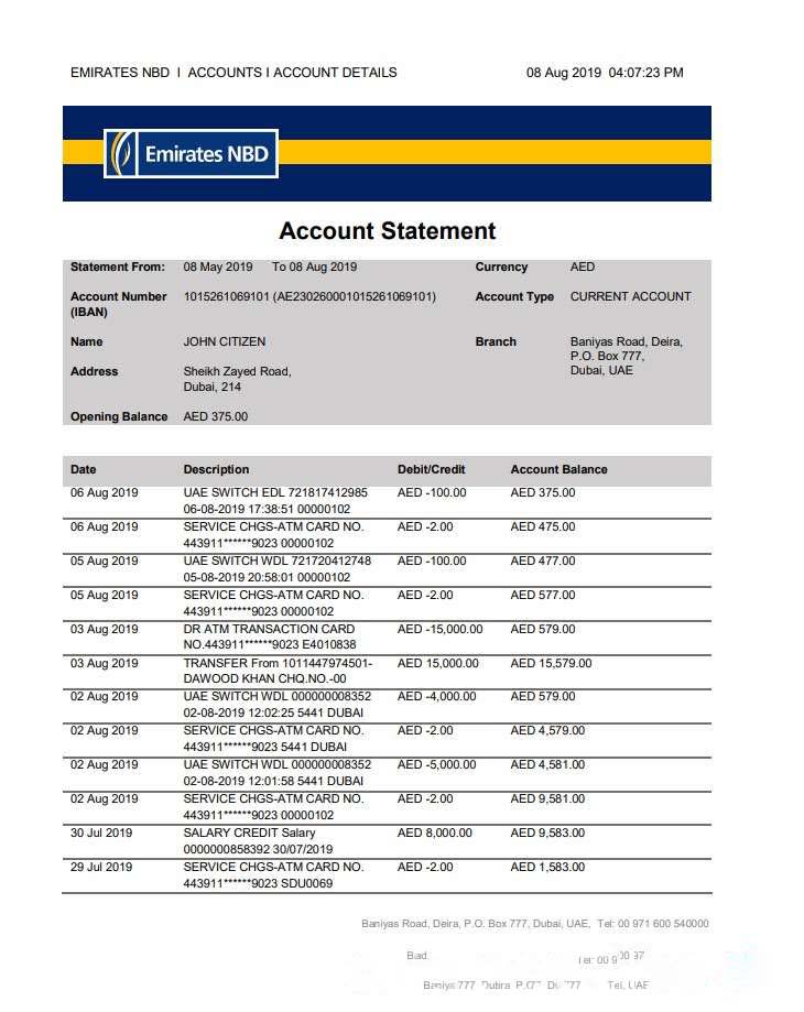 UAE Dubai Emirates NBD bank proof of address statement template in Word and PDF format download template file