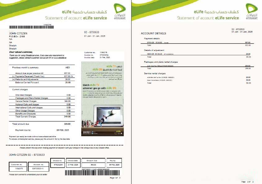 UAE Etisalat utility bill template in Word and PDF formats, 2 pages, version 2 download template file
