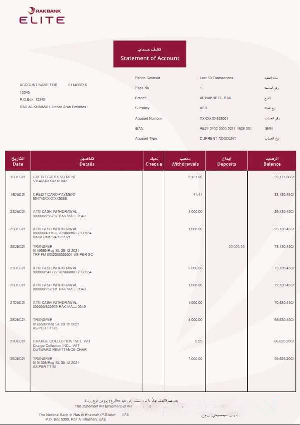 UAE Rakbank Elite bank statement Word and PDF template w download template file