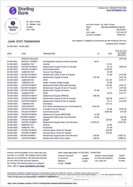 UK Starling Bank statement Word and PDF template download template file