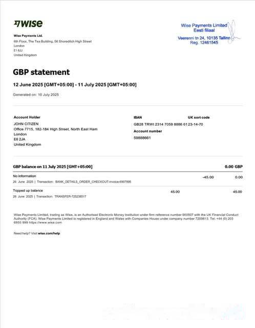 UK Wise Payments account statement Word and PDF template download template file