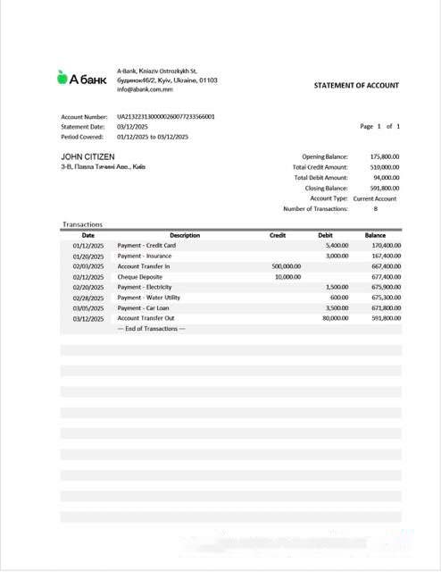 Ukraine A Bank statement of account Word and PDF template download template file