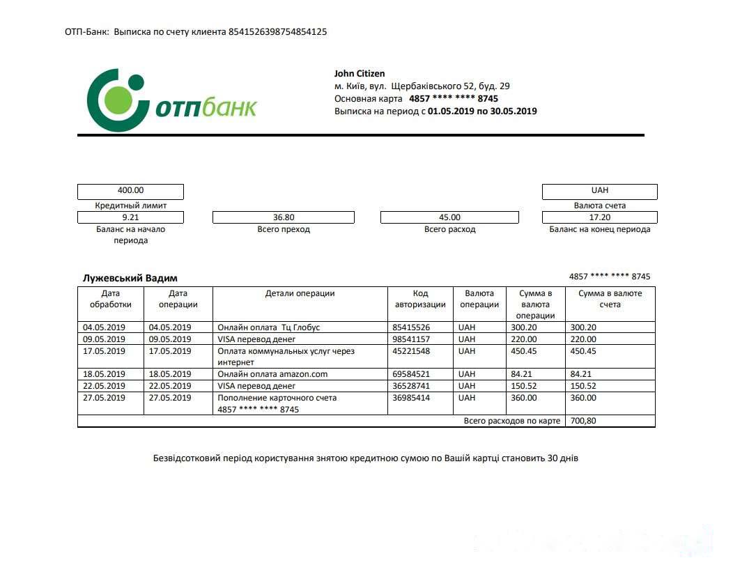 Ukraine OTP bank proof of address statement template in Word and PDF format, .doc and .pdf format download template file
