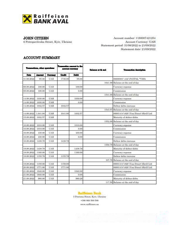 Ukraine Raiffeisen bank statement, Excel and PDF template download template file