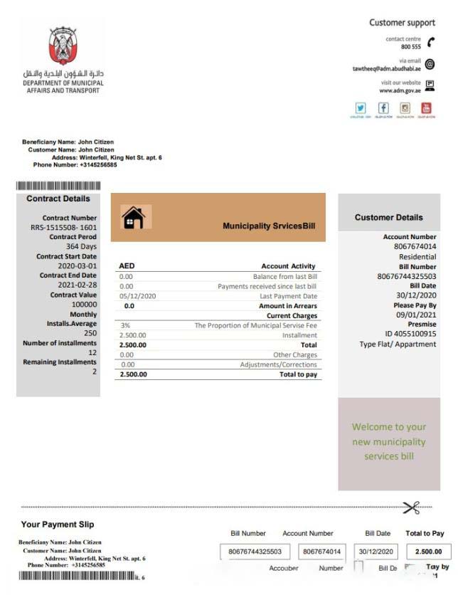United Arab Emirates Abu Dhabi Municipality Service utility bill template in Word and PDF format download template file
